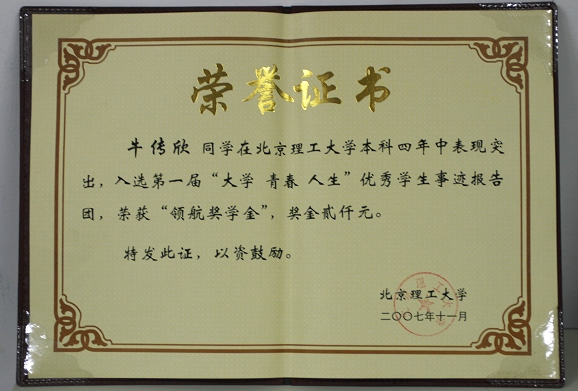 【圖】信息學(xué)院03級(jí)本科生牛傳欣榮獲“領(lǐng)航獎(jiǎng)學(xué)金”