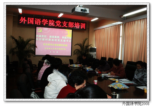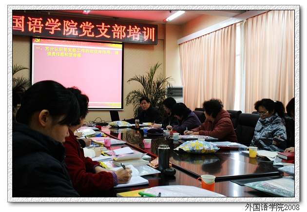 2008年1月22日上午,外國語學院在中心教學樓515會議室進行黨支部書記培訓講座。主講人為外國語學院分黨委書記王文清同志,副書記、副院長吳文君及學院教工黨支部書記和學生黨支部書記參加了輔導講座。