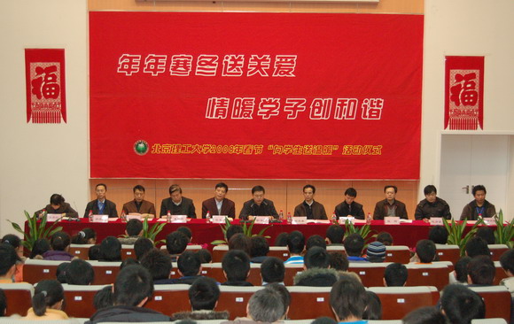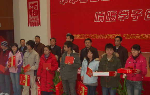 2008年1月25日,北京理工大學良鄉(xiāng)校區(qū)綜合教學樓綜合演藝廳內(nèi)洋溢著陣陣歡聲和融融暖意,300名2007級家庭經(jīng)濟困難學生代表濟濟一堂,參加了學校組織的以“年年寒冬送關(guān)愛 情暖學子創(chuàng)和諧”為主題的2008年春節(jié)“向?qū)W生送溫暖”活動。