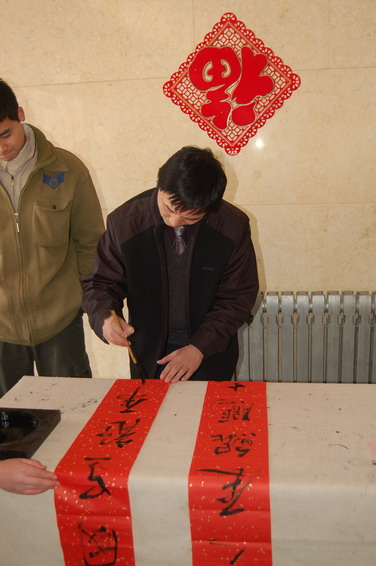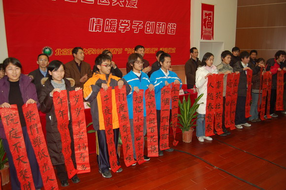 從去年開始,我校老干部書法家協(xié)會和無陽齋學生書畫社的書法愛好者們?yōu)橥瑢W們書寫春聯(lián),通過紅彤彤的春聯(lián)讓學生把學校的祝福和關(guān)懷捎回家?!跋?qū)W生送溫暖”活動已成為具有北京理工大學傳統(tǒng)特色的工作之一,而且活動的形式越來越新穎,內(nèi)容越來越豐富,對學生的關(guān)懷越來越人性化。