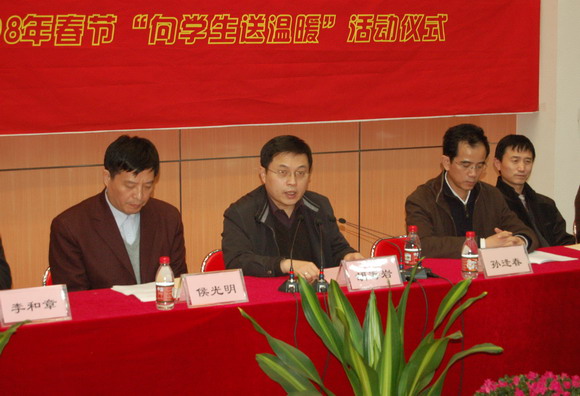 隨后,校長胡海巖發(fā)表了熱情洋溢的講話。他首先代表學校黨委和行政向與會學生及其家人致以新春誠摯的祝福,他指出:“學生資助工作是解決學生最關(guān)心、最直接、最現(xiàn)實利益問題的主要渠道,是構(gòu)建社會主義和諧校園的核心工作之一。黨的十七大報告中指出,要加快推進以改善民生為重點的社會建設(shè),而其中就包括要健全學生資助制度。長期以來,北京理工大學始終堅持在實施大學生思想政治教育中注重關(guān)心人、幫助人,始終堅持以學生為本,為學生辦實事辦好事,一直把學生資助工作作為關(guān)心學生、實施德育的重要內(nèi)容常抓不懈,采取一系列幫困助困措施,不斷改進和創(chuàng)新工作方式和方法,不斷完善資助體系的建設(shè),努力解決大學生的實際困難,幫助貧困大學生完成學業(yè),努力把黨和政府對大學生的關(guān)懷落到實處。