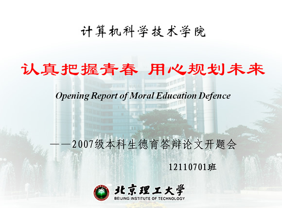 此次12110701班德育答辯開題會(huì)拉開了計(jì)算機(jī)科學(xué)技術(shù)學(xué)院2007級(jí)的德育答辯開題會(huì)的序幕,其他每個(gè)班級(jí)都會(huì)舉行這樣的別具意義的開題會(huì)。在2007級(jí)本科生中舉行的德育答辯開題報(bào)告會(huì)是僅僅是大學(xué)四年德育答辯的一個(gè)開始,我們希望所有同學(xué)都“認(rèn)真把握青春,用心規(guī)劃未來”,用自己的實(shí)際行動(dòng)來譜寫自己大學(xué)生活的一份滿意答卷。