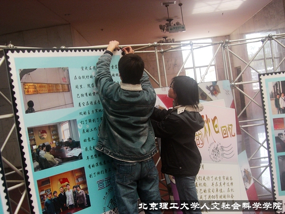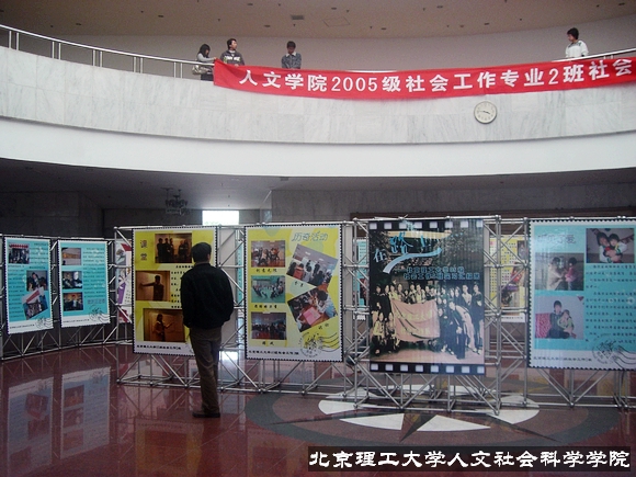 2008年3月30日下午,人文社會科學(xué)學(xué)院05級社會工作2班在中心教學(xué)樓一層大廳布置并組織了以“宣傳社工實習(xí)成果,加強班級文化建設(shè)”為主題的展覽活動。作為北京理工大學(xué)為數(shù)不多的以班級為獨立單位進行實習(xí)成果展覽的活動,本次展覽將在中教一層大廳持續(xù)一周時間。