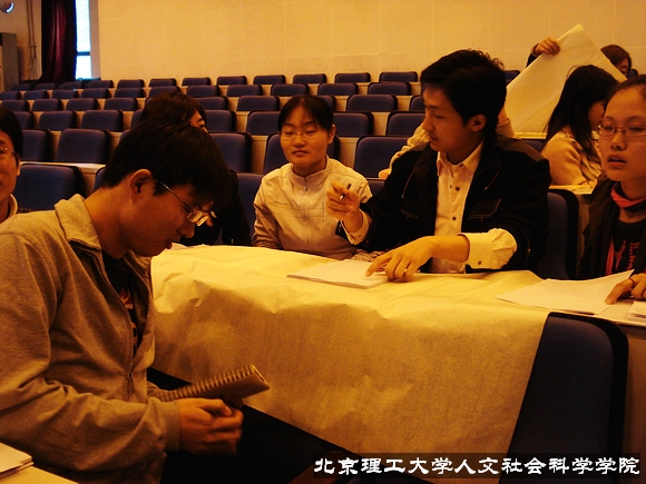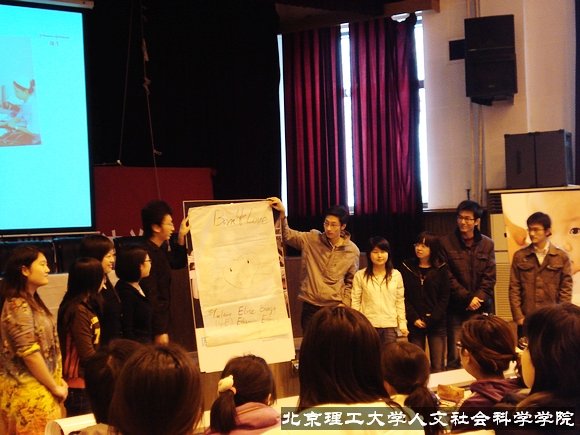 接下來進行的是由陳晗女士為我們組織的破冰游戲。在這個環(huán)節(jié)中,事先被隨機分成了八組的同學們,按要求要在十五分鐘內,與自己同組的同學共同協(xié)作討論,選出一位組長,確定自己組的組名、組歌以及口號。緊迫的時間使之前還不甚熟悉的同學們都不再拘束,與大家一起分享自己的看法。隨后,所有的小組輪流上臺,與大家分享他們的討論結果。同學們在游戲中找尋到了小組中的集體意識,為之后即將進行的分組討論做好了鋪墊。