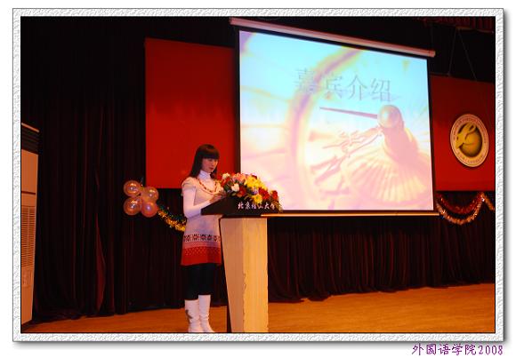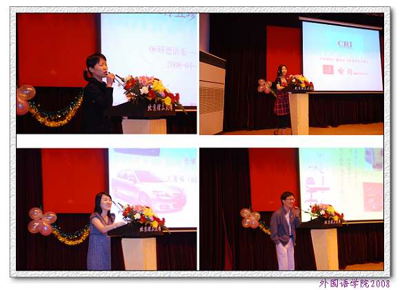 中國(guó)國(guó)際廣播電臺(tái)《飛魚秀》節(jié)目著名主持人98級(jí)英語(yǔ)專業(yè)畢業(yè)生喻舟學(xué)姐作為第一個(gè)講演的優(yōu)秀畢業(yè)生,深情地回憶起她在外國(guó)語(yǔ)學(xué)院的美好時(shí)光,講述了許多與老師同學(xué)的逸聞趣事。身為專業(yè)播音員的她很快把全場(chǎng)的氣氛調(diào)動(dòng)起來(lái),為之后的講演奠定下輕松歡快的基調(diào)。03級(jí)日語(yǔ)專業(yè)畢業(yè)生,現(xiàn)供職于長(zhǎng)安馬自達(dá)汽車有限公司的文慧福學(xué)姐,詳細(xì)地向?qū)W弟學(xué)妹們介紹了自己的實(shí)習(xí)面試經(jīng)驗(yàn),月薪過(guò)萬(wàn)的她耐心地回答了同學(xué)的提問(wèn),相信有意找工作的同學(xué)一定在她的講座中受益匪淺。新西蘭駐華使館人員98級(jí)英語(yǔ)專業(yè)畢業(yè)生王旭學(xué)姐,菲律賓駐華使館人員98級(jí)英語(yǔ)專業(yè)畢業(yè)生王永峰學(xué)長(zhǎng)在北京理工大學(xué)共同學(xué)習(xí)的日子里不但在學(xué)業(yè)上相互鼓勵(lì),共同奮斗,更在四年大學(xué)結(jié)束后步入婚姻的殿堂。他們風(fēng)雨同舟的奮斗歷程與相濡以沫的愛(ài)情經(jīng)歷,極大地震撼了在場(chǎng)的每位聽眾。外國(guó)語(yǔ)學(xué)院05級(jí)德語(yǔ)專業(yè)研究生廖冰萍學(xué)姐通過(guò)親自制作的演示材料生動(dòng)地追述自己在北理工的六年時(shí)光。她以自己的親身經(jīng)歷反復(fù)強(qiáng)調(diào)學(xué)習(xí)態(tài)度的重要性,品學(xué)兼優(yōu)的她曾在大四獲得三個(gè)月的赴德實(shí)習(xí)機(jī)會(huì)。作為一名06級(jí)軍訓(xùn)指導(dǎo)員老師,她的開朗熱情,雷厲風(fēng)行曾給所有軍訓(xùn)學(xué)員留下了深刻的印象,因此她的講演也顯得格外親切。北京拓普康商貿(mào)有限公司日本事務(wù)聯(lián)系負(fù)責(zé)人,03級(jí)日語(yǔ)專業(yè)畢業(yè)生鄧澤生學(xué)長(zhǎng),簡(jiǎn)潔地介紹了自己的大學(xué)經(jīng)歷,并補(bǔ)充了之前的面試經(jīng)驗(yàn)。他的自信隨和貫穿著他的講演,堅(jiān)信態(tài)度決定一切的他,在強(qiáng)手如林的最終面試中過(guò)關(guān)斬將,被成功聘用。