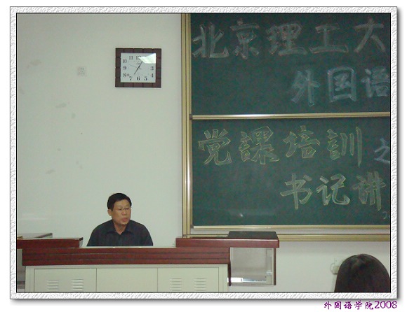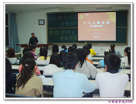 最后在結(jié)束語(yǔ)中,王書(shū)記引用江澤民同志和胡錦濤同志的兩段名言向同學(xué)們闡明維護(hù)黨章,遵守黨章的重要性。此次書(shū)記講黨課延續(xù)了上學(xué)期的黨課形式,并使內(nèi)容更加具體與豐富。書(shū)記的講解更加具有經(jīng)驗(yàn)性和權(quán)威性。隨著外國(guó)語(yǔ)學(xué)院07級(jí)入黨積極分子的增加,聆聽(tīng)黨課的同學(xué)也在遞增,從每一位同學(xué)認(rèn)真的表情,我們能夠看到外國(guó)語(yǔ)學(xué)院學(xué)生黨建工作的美好明天。