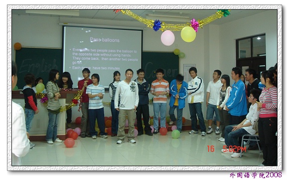 此次外語角共有“group talk”、“傳氣球”、“英文繞口令”、“心有靈犀”等節(jié)目,使前來參加的同學不僅鍛煉了口語,更是參與了好玩刺激的游戲。