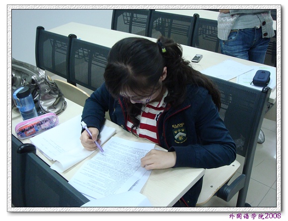外國語學(xué)院2007級(jí)共有學(xué)生90余名,其中遞交入黨申請(qǐng)書的同學(xué)占學(xué)生總?cè)藬?shù)的一半,入黨積極分子40余名。本次考試安排在學(xué)校太極操比賽之后,同學(xué)們都準(zhǔn)時(shí)地來到教室,認(rèn)真地參加考試,顯示出積極分子追求進(jìn)步、努力提高的決心。