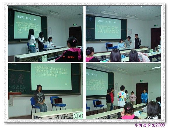 4月27日晚,外國語學(xué)院2007級“青春奧運(yùn)文明行”知識競賽在良鄉(xiāng)校區(qū)理科教學(xué)樓105隆重舉行。宇航學(xué)院徐瑩瑩老師,機(jī)車學(xué)院李文彪老師,理學(xué)院閆磊老師,設(shè)計學(xué)院毛昭君老師,計算機(jī)學(xué)院高強(qiáng)老師,外國語學(xué)院張磊老師作為嘉賓評委出席此次競賽。外國語學(xué)院2007級共組織6個代表隊參加比賽。比賽分為5輪,分別為必答題、搶答題、視頻題、表演題、風(fēng)險題,內(nèi)容涉及奧林匹克運(yùn)動歷史知識、北京奧運(yùn)會組織籌備情況、歷屆奧運(yùn)會比賽、校園文明禮儀、涉外禮儀等。