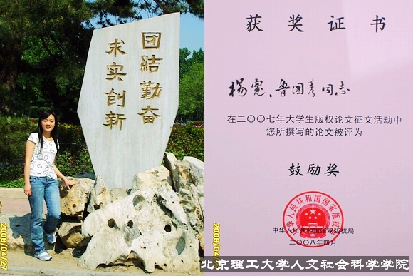 由于對(duì)專業(yè)的喜愛,我積極參與了相關(guān)的各項(xiàng)學(xué)術(shù)活動(dòng)。在過程中我感受到了專業(yè)理論研究的博大精深,也收獲了許多經(jīng)驗(yàn)和榮譽(yù)。2007年下半年,撰寫了論文 《淺論網(wǎng)絡(luò)服務(wù)提供者的責(zé)任問題》,這篇文章在《北京理工大學(xué)學(xué)報(bào)》(社會(huì)科學(xué)版)2008年第2期發(fā)表。2008年4月,我所寫的《網(wǎng)絡(luò)服務(wù)提供者的責(zé)任問題簡(jiǎn)析》一文獲得中國(guó)國(guó)家版權(quán)局主辦的“全國(guó)大學(xué)生版權(quán)論文征文活動(dòng)”三等獎(jiǎng),并收錄在《青春與版權(quán)同行》論文集中。此外我還參與了兩個(gè)法學(xué)領(lǐng)域課題小組的研究活動(dòng),一個(gè)是中國(guó)人民大學(xué)中歐法學(xué)研究項(xiàng)目“有限責(zé)任公司小股東退出機(jī)制”的課題研究,并預(yù)計(jì)發(fā)表論文1篇。另一個(gè)是北京理工大學(xué)國(guó)家大學(xué)生創(chuàng)新性試驗(yàn)計(jì)劃項(xiàng)目“我國(guó)農(nóng)村土地承包經(jīng)營(yíng)權(quán)的流轉(zhuǎn)和創(chuàng)新”,我們結(jié)合實(shí)地調(diào)查得出的數(shù)據(jù),通過撰寫論文的形式歸納了我們的調(diào)查研究結(jié)果。