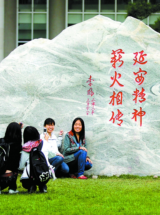 昨天,一尊刻有李鵬同志題詞“延安精神,薪火相傳”的天然景觀石,在北京理工大學(xué)落成。這尊長5.6米、寬1.4米、高3.6米,重達41.8噸的花崗巖景觀石,產(chǎn)自革命圣地延安。 本報記者 戴冰攝