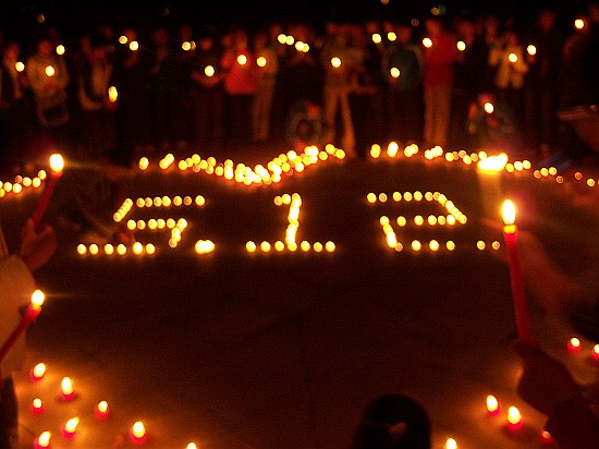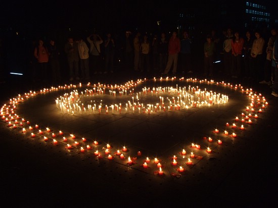 現(xiàn)場(chǎng)每位同學(xué)手持一支蠟燭,沒有燈光,沒有喧囂,有的只是北理學(xué)子對(duì)災(zāi)區(qū)人民發(fā)自內(nèi)心的哀悼與祝福。同學(xué)們用手中的蠟燭點(diǎn)燃了地上擺放著的紅色心形蠟燭和“5.12”字樣白色蠟燭,安靜的燭光映紅了同學(xué)們尚未成熟卻帶有一絲憂傷的臉龐。大家一起唱起了《讓世界充滿愛》后,一切都沉靜下來(lái),只剩下燭火被風(fēng)吹動(dòng)的哧哧聲,這時(shí),所有同學(xué)都在靜靜地為死去的亡靈默哀三分鐘。現(xiàn)場(chǎng)的每一位同學(xué)都十分感動(dòng),都為災(zāi)區(qū)而默默地祝福。
