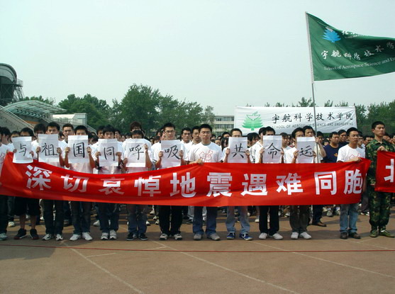 得知參加默哀活動的通知后,宇航學院全體師生立刻自發(fā)的組織起來,為下午的默哀活動做準備。學院在中午趕制了橫幅,學院里有書法特長學生上午第二大節(jié)下課后就立馬趕到學院分團委,花費一中午的時間書寫了標語,表達了宇航學子對四川大地震中遇難同胞的哀悼,對祖國和人民血脈相連的親情,對祖國戰(zhàn)勝困難勇往直前的信念!學院黨委副書記董兆波老師也顧不上休息,親自布置了各項工作。