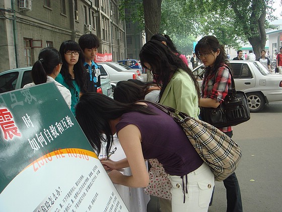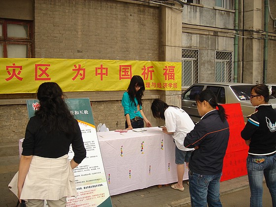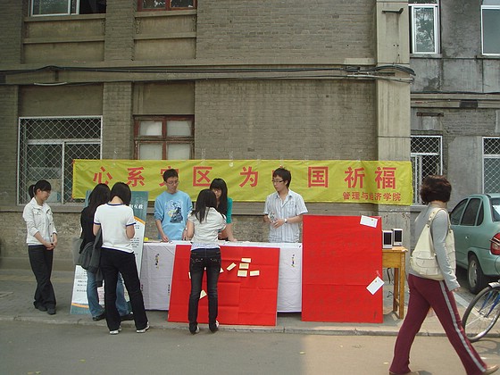 5月16日,由管理與經(jīng)濟學院學生會主辦的“心系災區(qū) 為祖國祈?!被顒樱诰┕な程脤γ孢M行。