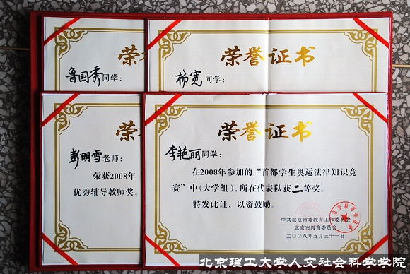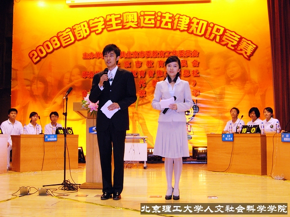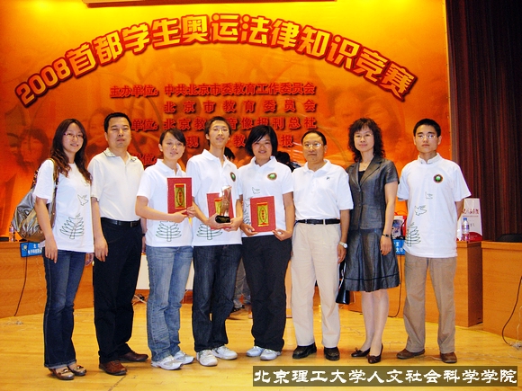 2008年5月31日下午兩點(diǎn),2008首都學(xué)生奧運(yùn)法律知識(shí)競(jìng)賽大學(xué)組決賽在史家小學(xué)禮堂隆重舉行,我校黨委宣傳部部長(zhǎng)賀亞蘭、人文學(xué)院黨委書記張劍軍、人文學(xué)院副書記副院長(zhǎng)賈利軍親臨比賽現(xiàn)場(chǎng)加油助威。人文學(xué)院05級(jí)法學(xué)專業(yè)楊寬、李艷麗、魯國(guó)秀三名同學(xué)代表我校出賽,同北京航空航天大學(xué)、北京第二外國(guó)語(yǔ)學(xué)校等五所高校代表隊(duì)一起,開始了激烈角逐。代表隊(duì)最終不負(fù)重望,獲得二等獎(jiǎng)的好成績(jī)。奧運(yùn)法律知識(shí)競(jìng)賽在由人文學(xué)院2006級(jí)40名同學(xué)組成的啦啦隊(duì)喊出的響亮口號(hào)——“法治中國(guó),和諧奧運(yùn),激情北理,青春飛揚(yáng)”中開拉了序幕。經(jīng)過(guò)一個(gè)月的緊張備戰(zhàn),楊寬、李艷麗、魯國(guó)秀三名同學(xué)在賽場(chǎng)上信心十足,在必答題、搶答題、風(fēng)險(xiǎn)題三個(gè)環(huán)節(jié)中沉著冷靜、團(tuán)結(jié)合作,從容應(yīng)對(duì)多變的賽場(chǎng)形勢(shì),他們的精彩表現(xiàn)贏得了全場(chǎng)觀眾的熱烈掌聲,并終以優(yōu)異成績(jī)獲得二等獎(jiǎng)。