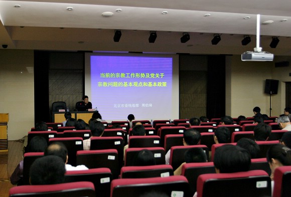 6月3日,我校在圖書館一層報告廳召開了宗教形勢報告會。北京市統(tǒng)戰(zhàn)部副部長周伯琦應邀做了題為《當前的宗教工作形勢及黨關于宗教問題的基本觀點和基本政策》的報告。我校黨委常委、紀委書記楊蜀康出席會議。參加會議的有各分黨委書記、副書記、專職學生工作干部、有關職能部門負責人等一百余人參加。報告會由楊蜀康書記主持。