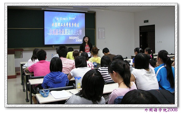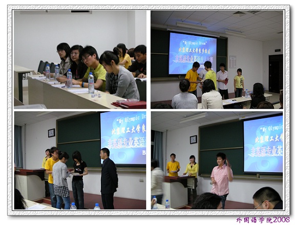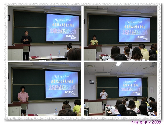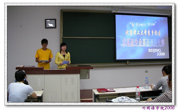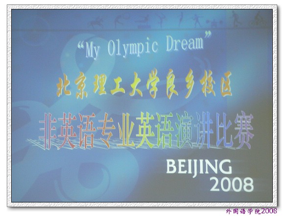 2008年6月3日,由北京理工大學(xué)外國語學(xué)院和校團委聯(lián)合舉辦的“My Olympic Dream”北京理工大學(xué)良鄉(xiāng)校區(qū)2007級非英語專業(yè)英語演講比賽決賽在理科教學(xué)樓306進行。外國語學(xué)驗英語專業(yè)研究生謝森、吳越以及“外研社杯”全國大學(xué)生英語辯論賽亞軍得主許慎、王莉娜擔任本場比賽的評委。外國語學(xué)院2007級英語專業(yè)學(xué)生胡紹聰、李立柏擔任比賽主持人。在初賽中一路過關(guān)斬將最終晉級的來自不同學(xué)院的六名選手參加了本次比賽。