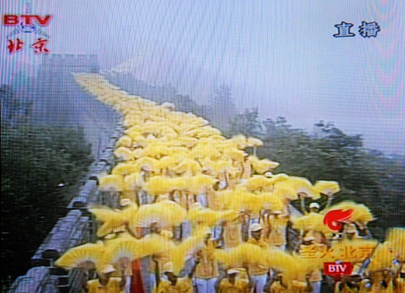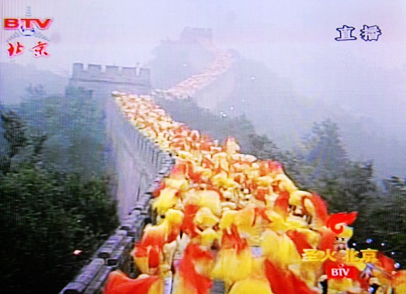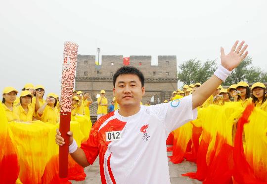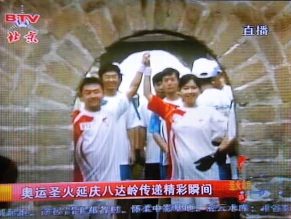 長城上的火炬?zhèn)鬟f由18名火炬手共同完成。經(jīng)北一烽火臺,一直傳遞到北四烽火臺頂端。2008名青年學生身著黃色上衣、白色褲子和黃色帽子用紅旗、扇子在長城上以行為藝術(shù)的手法組成龍的形象,與奧運圣火交相輝映,頗為壯觀。