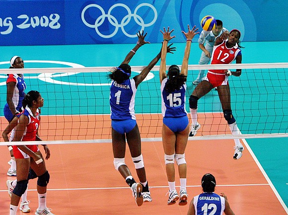 在剛剛結(jié)束的北京奧運會女子排球預(yù)賽A組古巴對委內(nèi)瑞拉的比賽中,古巴隊(紅上衣)以3-0戰(zhàn)勝委內(nèi)瑞拉隊。