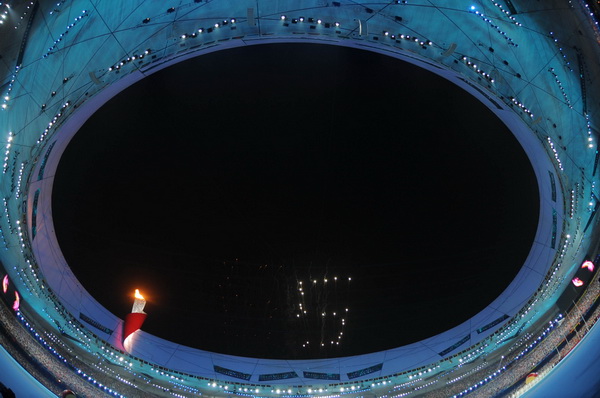 與開幕式相比,閉幕式最有特色的是“鳥巢”內(nèi)的“五環(huán)”煙火,此次呈現(xiàn)出了紅、黃、藍、綠、白五種顏色。煙火倒計時數(shù)字的展現(xiàn)運用的是動態(tài)而非靜態(tài)方式,即觀眾可以在天空中看到數(shù)字形成的過程。