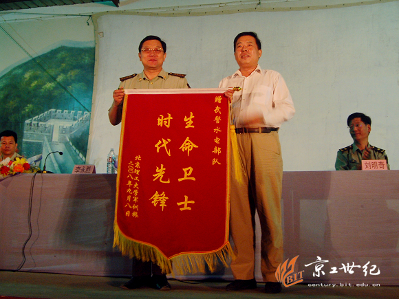 最后,李和章副校長再次感謝武警水電部隊抗震救災(zāi)先進事跡報告團的精彩報告并向武警水電部隊贈送了錦旗。
