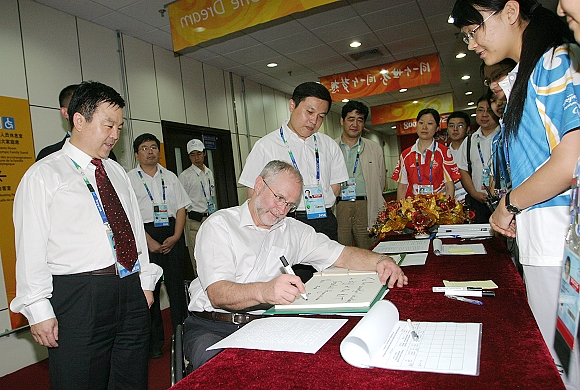 在殘奧大家庭接待處,菲利普˙克雷文先生高興地為場館團(tuán)隊(duì)工作人員和志愿者留言:致北京理工大學(xué)體育館盲人門球比賽運(yùn)行團(tuán)隊(duì)的工作人員和志愿者——你們是最棒的!