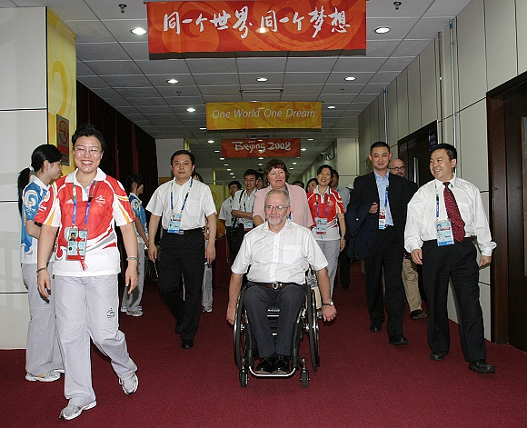 在北京2008年殘奧會盲人門球比賽期間,國際殘奧委會主席菲利普˙克雷文先生及其夫人來我校體育館觀看了盲人門球半決賽。中國科學(xué)院院士、北京理工大學(xué)校長胡海巖,北京理工大學(xué)黨委副書記、副校長,北京理工大學(xué)體育館場館主任楊賓,北京理工大學(xué)副校長,北京理工大學(xué)體育館場館設(shè)施與環(huán)境副主任趙顯利親至場館殘奧大家庭入口迎接。