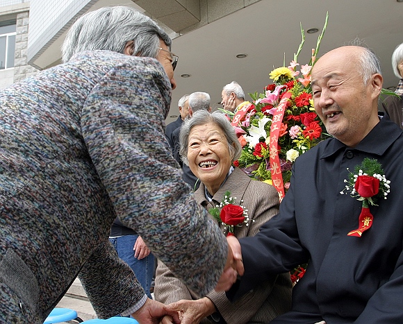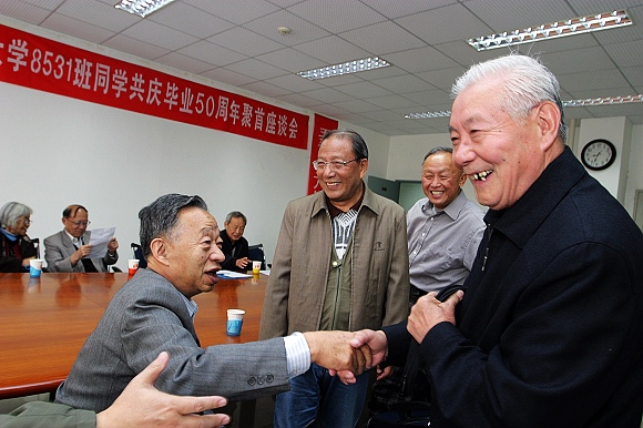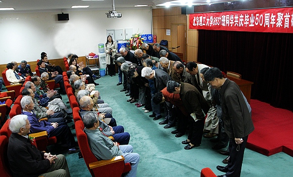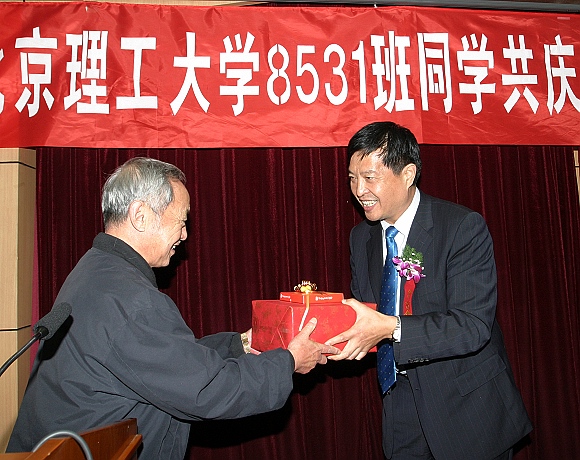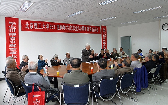 十月九日,北京理工大學(xué)(原北京工業(yè)學(xué)院)8531班25名老校友從全國各地會聚母校,舉行該班同學(xué)畢業(yè)五十周年慶典活動,同時表示對母校及執(zhí)教過該班的老師們的敬意和感謝。慶典在逸夫樓二層報告廳舉行。校黨委侯光明副書記、信息科學(xué)技術(shù)學(xué)院領(lǐng)導(dǎo)薛唯書記、仲順安院長、趙躍進(jìn)系主任以及校友會、宣傳部、學(xué)生工作部、校辦和后勤部門的有關(guān)領(lǐng)導(dǎo)以及教過8531班的老師出席了會議。25名年逾古稀的老學(xué)生列隊向嚴(yán)沛然教授、于美文教授等15名老師長行鞠躬禮并贈送紀(jì)念品。老校友代表王邦益研究員向母校及老師們匯報了50年來同學(xué)們的奮斗歷程及取得的成績。