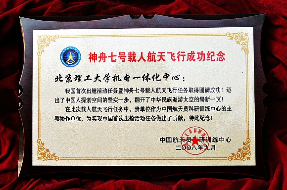 日前,我校機械與車輛工程學院機電一體化中心獲得了由中國航天員科研訓練中心頒發(fā)的“神舟七號載人航天飛行成功紀念獎”,為我國航天事業(yè)做出了貢獻,為我校贏得了榮譽。