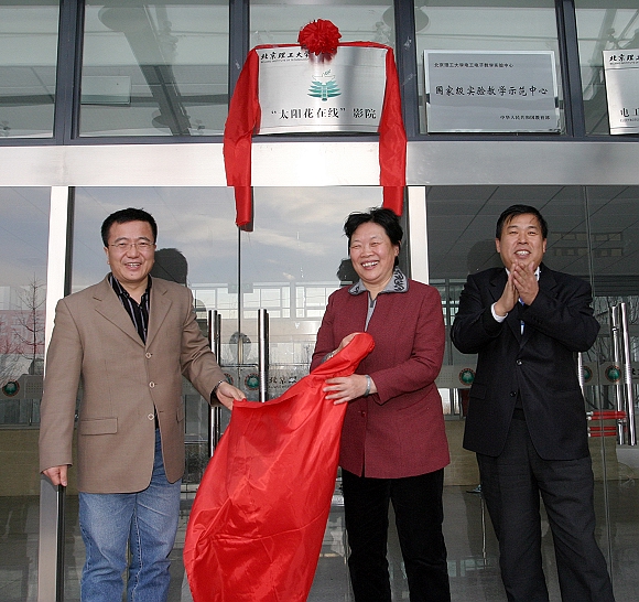教育部社會(huì)科學(xué)司魏小波處長(zhǎng)、中國(guó)教育電視臺(tái)呂學(xué)武副臺(tái)長(zhǎng)與我校副校長(zhǎng)李和章共同為“太陽(yáng)花在線”影院揭牌。