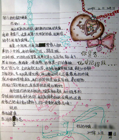 3月初,基礎(chǔ)教育學(xué)院劉毅同學(xué)收到了災(zāi)區(qū)小朋友的回信。信的內(nèi)容簡(jiǎn)短樸實(shí),但充滿(mǎn)了堅(jiān)強(qiáng)與樂(lè)觀(guān)的精神。我校同學(xué)的愛(ài)心行動(dòng)得到了回饋,在這個(gè)互動(dòng)過(guò)程中,同學(xué)們和災(zāi)區(qū)小朋友都是受益者。