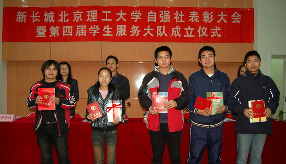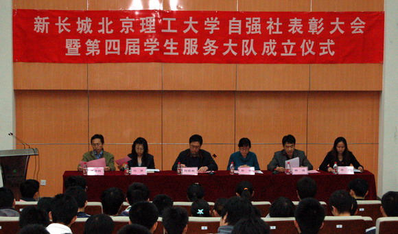 2009年3月25日下午,新長(zhǎng)城北京理工大學(xué)自強(qiáng)社表彰大會(huì)暨第四屆學(xué)生服務(wù)大隊(duì)成立儀式在我校良鄉(xiāng)校區(qū)綜合教學(xué)樓演藝廳舉行。學(xué)生工作處處長(zhǎng)劉影秋,學(xué)生工作處副處長(zhǎng)楊海,學(xué)生工作處副處長(zhǎng)許欣,學(xué)生工作處副處長(zhǎng)、基礎(chǔ)教育學(xué)院副書(shū)記、副院長(zhǎng)郭彥懿,中國(guó)國(guó)家圖書(shū)館業(yè)務(wù)管理處孫婠,中國(guó)國(guó)家圖書(shū)館保存本書(shū)庫(kù)劉赟出席會(huì)議。學(xué)生工作處、基礎(chǔ)教育學(xué)院相關(guān)教師,270名2008-2009學(xué)年獲得資助學(xué)生代表參加會(huì)議。會(huì)議由學(xué)生工作處副處長(zhǎng)楊海主持。