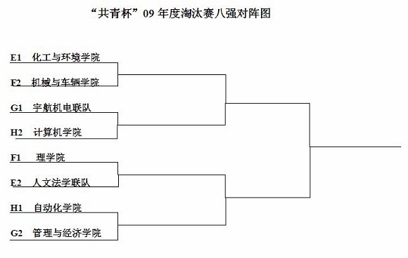15:00小組賽比賽全部結(jié)束,化工與環(huán)境學(xué)院、人文法學(xué)聯(lián)隊、理學(xué)院、機械與車輛學(xué)院、宇航機電聯(lián)隊、管理與經(jīng)濟學(xué)院、自動化學(xué)院、計算機學(xué)院等八支球隊順利晉級。相信他們淘汰賽中會有更精彩的表現(xiàn)。小組賽積分統(tǒng)計與淘汰賽對陣陣型如下,敬請同學(xué)們繼續(xù)關(guān)注“共青杯”精彩賽況。