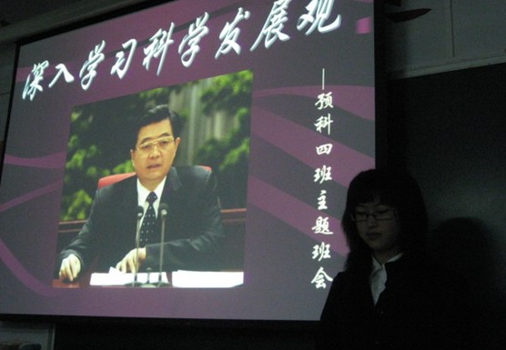 四班團支部書記張靜以PPT的形式和大家一起學習了黨的三代中央領導集體關于科學發(fā)展觀的重要論述,認真領會全面協調可持續(xù)的科學發(fā)展觀的重大意義。看完后,學生代表進行專題發(fā)言,暢談自己對科學發(fā)展觀的認識,特別是如何將科學發(fā)展觀與自身的人生規(guī)劃相結合的思考,提出了不少精彩的觀點和想法。