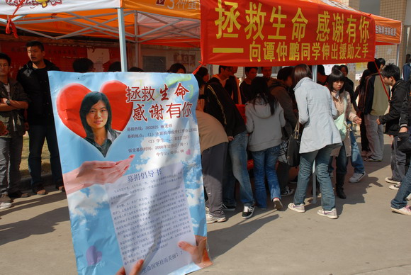 2008年11月30日,我校珠海學(xué)院05級軟件專業(yè)學(xué)生譚仲鵬經(jīng)確診患上肝上皮樣血管內(nèi)皮瘤,這是一種罕見的以上皮樣細(xì)胞為特征的血管內(nèi)皮腫瘤,如果就診不及時,病變細(xì)胞就會擴(kuò)散到整個肝臟,而肝移植手術(shù)成為挽救這條生命的唯一的希望,但是20余萬元昂貴的手術(shù)費(fèi)讓家庭貧困的譚仲鵬望而卻步。消息傳來,立即引起了珠海學(xué)院師生的高度關(guān)注,大家紛紛伸出援手,獻(xiàn)出愛心。捐款現(xiàn)場,陽光下,人潮涌動,愛心涌動?!?