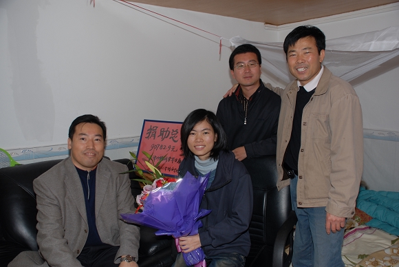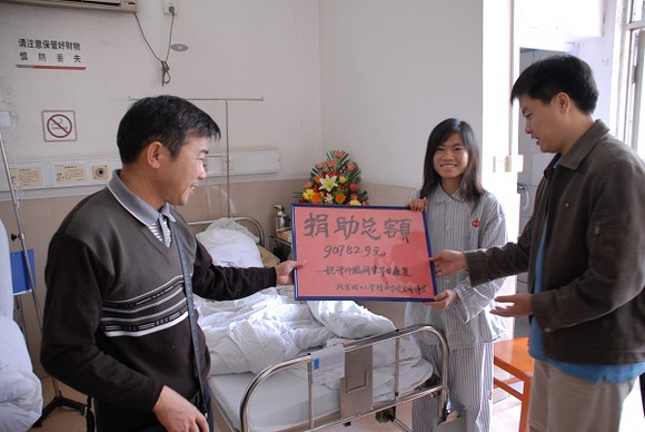 2008年12月13日,珠海學(xué)院黨委副書記、院長助理李紹勛,學(xué)生工作處、黨群工作處、計算機(jī)科學(xué)技術(shù)學(xué)院相關(guān)負(fù)責(zé)人等一行專程前往廣州中山大學(xué)第一附屬醫(yī)院,將九萬多的捐款及時送到了譚仲鵬的手中!同時還向譚仲鵬同學(xué)送上師生們?yōu)樗郎?zhǔn)備的禮物。