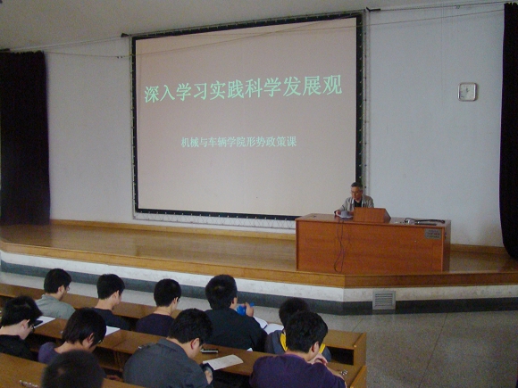 為了深化大學(xué)生對科學(xué)發(fā)展觀這一重大戰(zhàn)略思想的理解和認(rèn)識,更好地落實科學(xué)發(fā)展觀進教材、進課堂、進頭腦的工作, 4月10日下午,機械與車輛學(xué)院分黨委書記張英圍繞“大學(xué)生如何在學(xué)習(xí)實踐科學(xué)發(fā)展觀活動中有所收獲”這一主題,為學(xué)院本科生帶來了一堂精彩的形勢政策課。