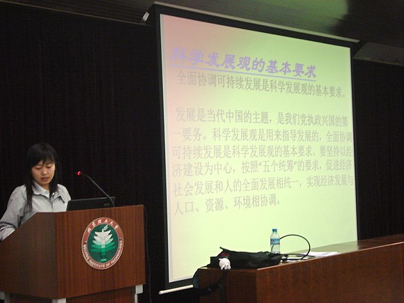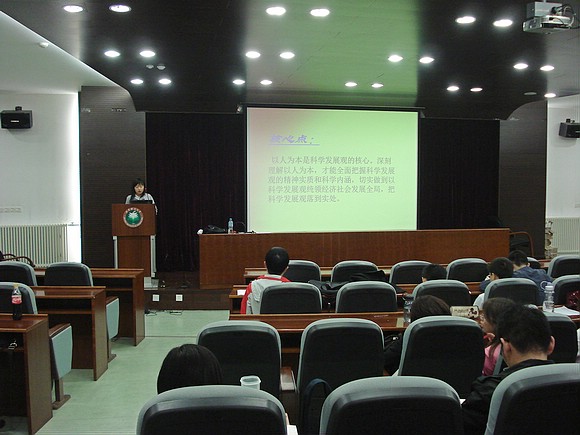 此次黨課由管理與經(jīng)濟學院共學會主席范斌同學主講,研究生和博士生中所有積極向黨組織靠攏、遞交入黨申請且通過上學期考試的學員參加。在本節(jié)黨課上,范斌同學詳細介紹了科學發(fā)展觀提出的時代背景、基本內(nèi)容、基本要求、深刻內(nèi)涵、核心與著眼點以及樹立和落實科學發(fā)展觀的原因、深入貫徹落實科學發(fā)展觀要注意的若干問題等。