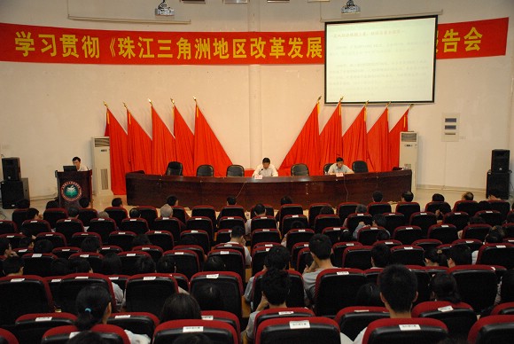 4月16日下午,珠海市委常委、宣傳部長(zhǎng)黃曉東蒞臨我校珠海學(xué)院,就《珠江三角洲地區(qū)改革發(fā)展規(guī)劃綱要(2008-2020年)》作專題報(bào)告,珠海學(xué)院院長(zhǎng)兼黨委書記劉淑艷等學(xué)院領(lǐng)導(dǎo)和300多名師生黨員與會(huì)聆聽。報(bào)告會(huì)由珠海學(xué)院黨委副書記、紀(jì)委書記兼副院長(zhǎng)王文清主持。