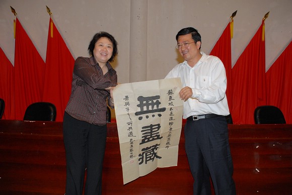 報(bào)告結(jié)束后,珠海學(xué)院院長(zhǎng)兼黨委書記劉淑艷代表珠海學(xué)院向市委常委、宣傳部長(zhǎng)黃曉東贈(zèng)送中國(guó)書法家協(xié)會(huì)會(huì)員的書法作品。