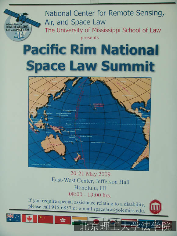 2009年5月19日至21日,“環(huán)太平洋地區(qū)國(guó)家空間法峰會(huì)”在太平洋上美麗的夏威夷大學(xué)東北中心召開(kāi),來(lái)自中國(guó)、美國(guó)、加拿大、澳大利亞、韓國(guó)、日本、印度、泰國(guó)、中國(guó)香港及聯(lián)合國(guó)外空事務(wù)辦公室的16位學(xué)者在會(huì)議上進(jìn)行了專題報(bào)告,分別介紹各自國(guó)家或地區(qū)的空間立法現(xiàn)狀及其與環(huán)太平洋國(guó)家空間法和空間活動(dòng)的關(guān)系。