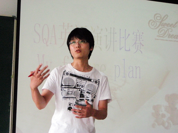 2009年6月26日下午,人文學(xué)院SQA中心學(xué)生英語演講比賽在研究生樓506舉行。參加英語演講比賽的有外國語學(xué)院研究生評委、SQA中心學(xué)生評委、參賽選手、學(xué)生觀眾和教師代表。本次演講比賽由人文學(xué)院學(xué)生工作辦公室組織,目的是通過演講比賽提高同學(xué)們參與集體活動的積極性,激發(fā)大家英語學(xué)習(xí)的熱情。本次演講比賽,在期末考試臨近的大環(huán)境下進(jìn)行,同學(xué)們克服困難主動報名,體現(xiàn)了SQA中心學(xué)生對英語學(xué)習(xí)的重視和熱愛。
