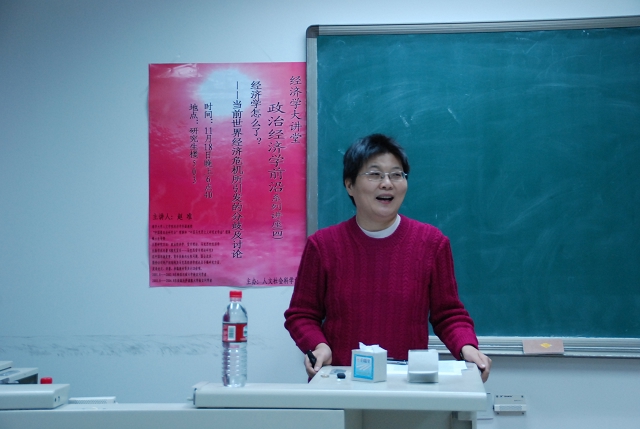 繼前三次經(jīng)濟(jì)學(xué)前沿講座的成功舉辦,2009年11月18日,人文社會(huì)科學(xué)學(xué)院政治經(jīng)濟(jì)學(xué)專業(yè)的同學(xué)迎來(lái)了經(jīng)濟(jì)學(xué)大講堂的第四次精彩學(xué)術(shù)講座。本次應(yīng)邀前來(lái)的是清華大學(xué)人文社會(huì)科學(xué)學(xué)院經(jīng)濟(jì)學(xué)研究所趙準(zhǔn)副教授,趙準(zhǔn)副教授是中國(guó)資本論研究會(huì)理事、中國(guó)馬克思主義研究史學(xué)會(huì)理事。她的主要研究方向是政治經(jīng)濟(jì)學(xué)、馬克思的貨幣理論等。出版了《探究貨幣——馬克思貨幣理論研究》等學(xué)術(shù)專著,在中國(guó)市場(chǎng)發(fā)育、貨幣供給內(nèi)生性問(wèn)題、國(guó)企改革、股份公司的產(chǎn)權(quán)及馬克思經(jīng)濟(jì)學(xué)理論及手稿等方面有深入的研究。