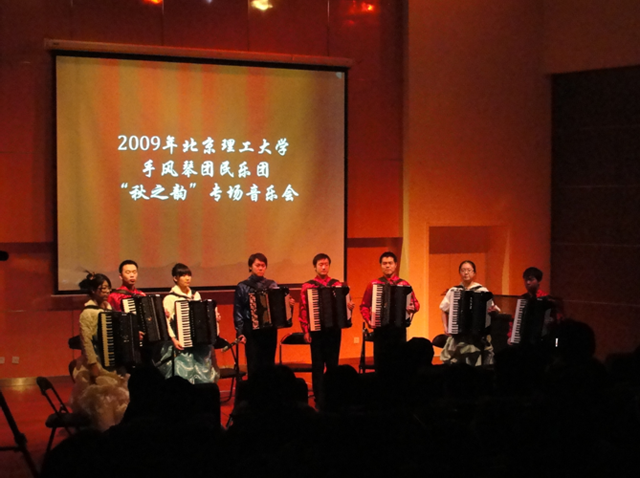 繼5日中關(guān)村演出之后,由北京理工大學(xué)團(tuán)委和藝術(shù)教育中心主辦,校藝術(shù)團(tuán)手風(fēng)琴團(tuán)、民樂團(tuán)承辦,校藝術(shù)團(tuán)服務(wù)中心協(xié)辦的“秋之韻”音樂沙龍于12月6日在北京理工大學(xué)基礎(chǔ)教育學(xué)院成功舉辦,這是一場(chǎng)由手風(fēng)琴團(tuán)又與民樂團(tuán)聯(lián)手演繹的一場(chǎng)鍵盤樂與民樂交相輝映、別具一格的演出盛宴。