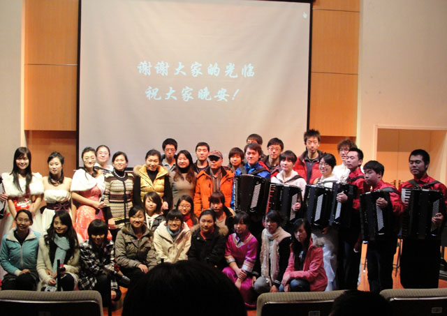 在我校大學(xué)生藝術(shù)團(tuán)手風(fēng)琴團(tuán)中有部分大四的學(xué)生即將離開學(xué)校,演出當(dāng)晚,他們中許多學(xué)生的父母也來到了演出現(xiàn)場(chǎng),校團(tuán)委書記徐強(qiáng)在開幕致詞中特別對(duì)我校即將畢業(yè)學(xué)生的家長表示了感謝。