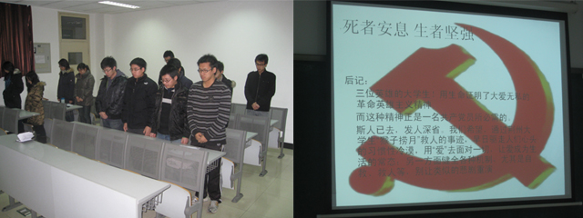 第二部分是各小組展示一段時(shí)間以來(lái)的學(xué)習(xí)心得成果。同學(xué)們各抒己見(jiàn),見(jiàn)解深刻。金晶同學(xué)說(shuō):“英雄之舉,往往是在瞬間作出的選擇,不可能是經(jīng)過(guò)反復(fù)的理性思考而成。但這種看起來(lái)偶發(fā)的選擇,實(shí)際上滲透著他對(duì)生命、對(duì)社會(huì)責(zé)任感的理解。”李勇同學(xué)指出:“三位英雄的行為證明,90后不是垮掉的一代,一定會(huì)努力承擔(dān)起社會(huì)賦予的責(zé)任。”史建偉同學(xué)說(shuō):“距事件發(fā)生至今將近一個(gè)月了。今天,我們的見(jiàn)解或許不會(huì)有多么高深。我們的討論也不在于得到一個(gè)極其正確的處理問(wèn)題的方法,我們的目的更不在于使每個(gè)人都要做到舍生奉獻(xiàn)。我們只是用這個(gè)機(jī)會(huì)讓大家表露自己的心聲。英雄遠(yuǎn)去,留給我們的不止是感動(dòng),更多的是啟迪,是思考。事實(shí)也證明我們的目的達(dá)到了。在這次總結(jié)會(huì)上能夠站起來(lái)發(fā)言的同學(xué)有些還因?yàn)榍訄?chǎng)而不能用流利的語(yǔ)言表達(dá)自己的心聲。但是,從他們的表情,從他們那不太流利的話語(yǔ)中,我們能夠體會(huì)到他們想說(shuō)的:關(guān)愛(ài)他人,珍愛(ài)生活,珍愛(ài)自己,珍惜生命。” 吳樂(lè)同學(xué)說(shuō)道:“三位英雄的大學(xué)生用生命證明了大愛(ài)無(wú)私的革命英雄主義精神。而這種精神正是一名共產(chǎn)黨員所必需的。 斯人已去,發(fā)人深省。我們希望,通過(guò)荊州大學(xué)生救人的事跡,早日驅(qū)走人們心頭的習(xí)慣性冷漠,用“愛(ài)”去面對(duì)一切,讓愛(ài)成為生活的常態(tài);另一方面健全各種機(jī)制,別讓類似的悲劇重演。 ”
