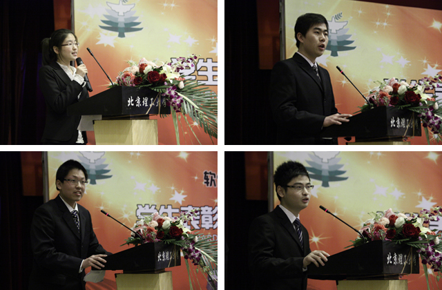 表彰大會(huì)分別就在學(xué)生工作、科研成績(jī)、學(xué)科競(jìng)賽、綜合素質(zhì)等方面做出優(yōu)異成績(jī)的同學(xué)分別給予了表彰。表彰環(huán)節(jié)首先播放感人事跡視頻,見證了這些優(yōu)秀的同學(xué)曾經(jīng)走過的精彩環(huán)節(jié)和留下的點(diǎn)點(diǎn)滴滴,接著宣讀頒獎(jiǎng)詞,表達(dá)了對(duì)這些表現(xiàn)優(yōu)異的先進(jìn)者的由衷贊美,最后,學(xué)院領(lǐng)導(dǎo)、老師為獲獎(jiǎng)的代表一一頒發(fā)了榮譽(yù)證書。優(yōu)秀學(xué)生干部獲獎(jiǎng)代表劉利凱同學(xué),科技創(chuàng)新團(tuán)隊(duì)獲獎(jiǎng)代表許昌達(dá)、劉煒同學(xué),軟件學(xué)院特色獎(jiǎng)勵(lì)自強(qiáng)不息獎(jiǎng)獲獎(jiǎng)代表馬金梅同學(xué)分別發(fā)表了感人至深的先進(jìn)事跡報(bào)告。