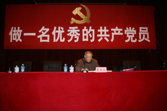 曹老從三個方面給全體黨員和入黨積極分子上了一堂內容豐富、事例鮮活、說服力強、感人至深而又不乏生動有趣的黨課。第一部分先從黨的性質、歷史任務、社會主義初級階段歷史使命講起,分析了學校承擔的歷史任務,社會和經濟發(fā)展的新形勢對學校的要求,后勤在改革發(fā)展中的使命等。第二部分主要講:“一個一”,牢記我是一名共產黨員;“兩個三”,即公正硬、傳幫帶;“四個五”,“見名利就讓,見困難就上,見先進就學,見后進就幫”。 第三部分主要講,怎樣落實成為一名優(yōu)秀的共產黨員。一是要靠共產黨員的自覺,后勤人要做到嘴勤、腿勤、眼勤,要有大局意識,二是要靠制度保障,制定符合實際、行之有效的制度。針對入黨積極分子曹老還著重談了三點:1.共產黨是什么樣的黨;2.怎樣爭取入黨;3.如何爭取入黨。