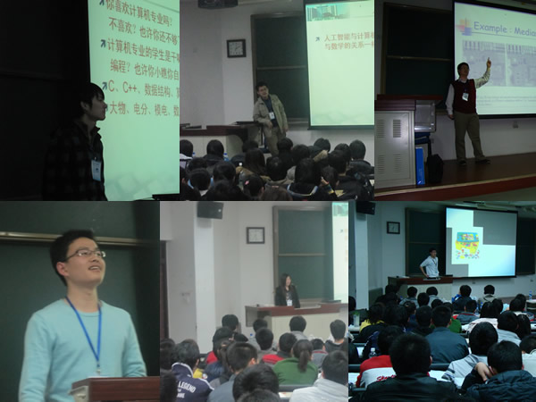 作為本次大會(huì)的特約嘉賓,2006級(jí)優(yōu)秀學(xué)長(zhǎng)楊蛟龍和2004級(jí)優(yōu)秀學(xué)長(zhǎng)林健也就自己參加競(jìng)賽的經(jīng)歷、大學(xué)的生活等方面與同學(xué)們做了交流。楊蛟龍跟同學(xué)們切身交流了他的學(xué)習(xí)歷程,指出個(gè)人知識(shí)能力和團(tuán)隊(duì)相互協(xié)作的重要性,是取得成功必不可少的條件;林健學(xué)長(zhǎng)提出要找到適合自己的興趣乃至確立自己的研究方向,并為之努力奮斗等,令在場(chǎng)聽(tīng)眾受益匪淺。