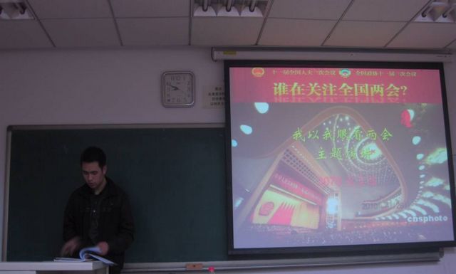 以“我以我眼看兩會”主題演講在5月初開始,同樣以支部為單位進行,支部內(nèi)每個成員結(jié)合“兩會”內(nèi)容制作PPT進行主題演講。其中,3076黨支部的黨員就哥本哈根氣候峰會進行演講,分析現(xiàn)象成因,倡導(dǎo)低碳生活,提出現(xiàn)在的大學(xué)生應(yīng)該怎樣以實際行動保護我們賴以生存的環(huán)境。3073支部的曹志濤同學(xué)向大家介紹了當今世界現(xiàn)存的法律體系,著重介紹了中國法律體系的形成,從古代的中華法系到當今結(jié)合了大陸法系并吸收中國傳統(tǒng)法律制度中的優(yōu)良成分形成的由中國特色的法律體系,讓同學(xué)們更加清楚的了解中國法律,在社會生活中做一個遵紀守法的公民。